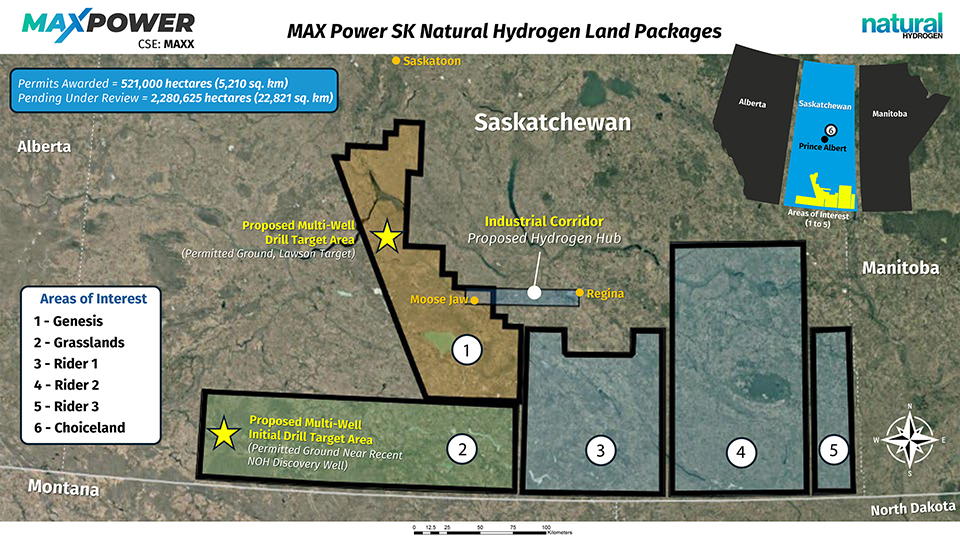 With 1.3 million acres (521,000 hectares) in permitted exploration ground, in a leading jurisdiction for potential Natural Hydrogen development, MAX Power’s geological team is prioritizing initial drill targets aimed at making North America’s first commercial discoveries of Natural Hydrogen (refer to June 18, 2025 news release).